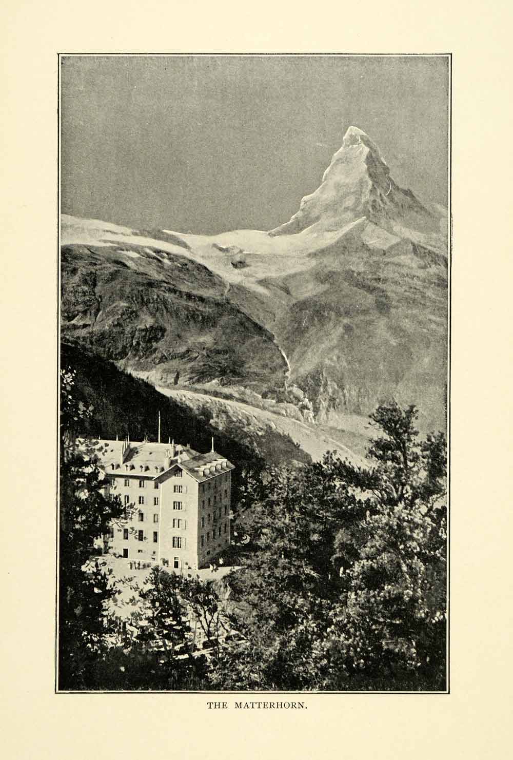 This is an original 1901 halftone print of The Matterhorn, a mountain in Switzerland known for being one of the highest peaks in the Alps, and one of the most difficult to climb.