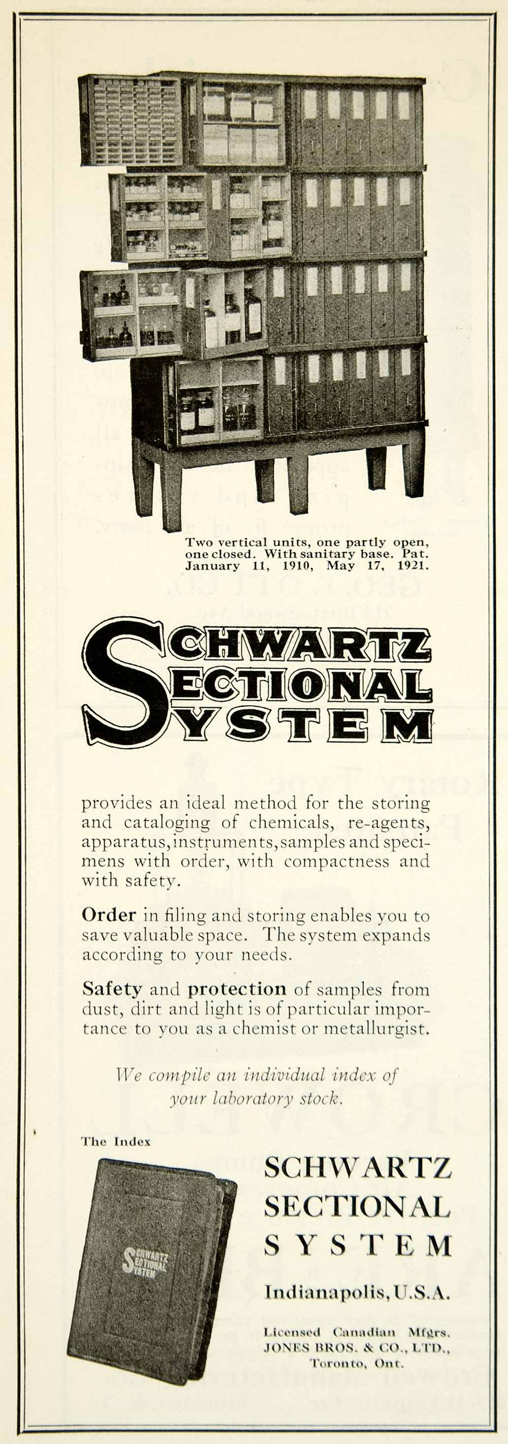 This is an original 1922 black and white print ad for the filing and storage cabinet for science laboratories that was sold by Schwatrz Sectional System of Indianapolis, IN.