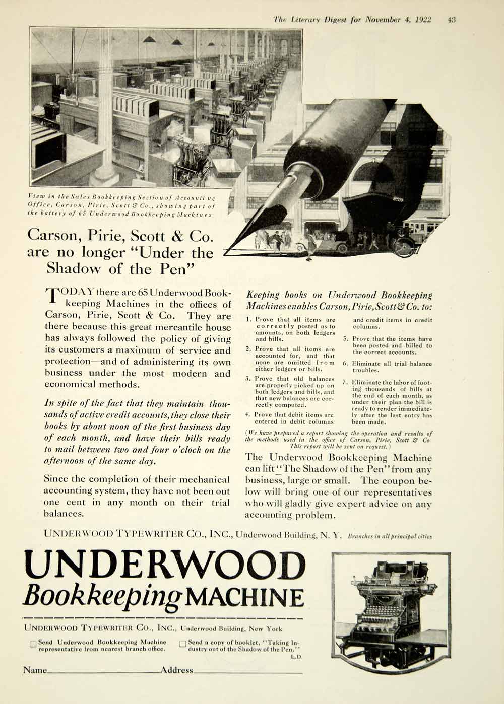 This is an original 1922 black and white print ad for the Underwood Bookkeeping Machine from the Underwood Typewriter Company in New York.