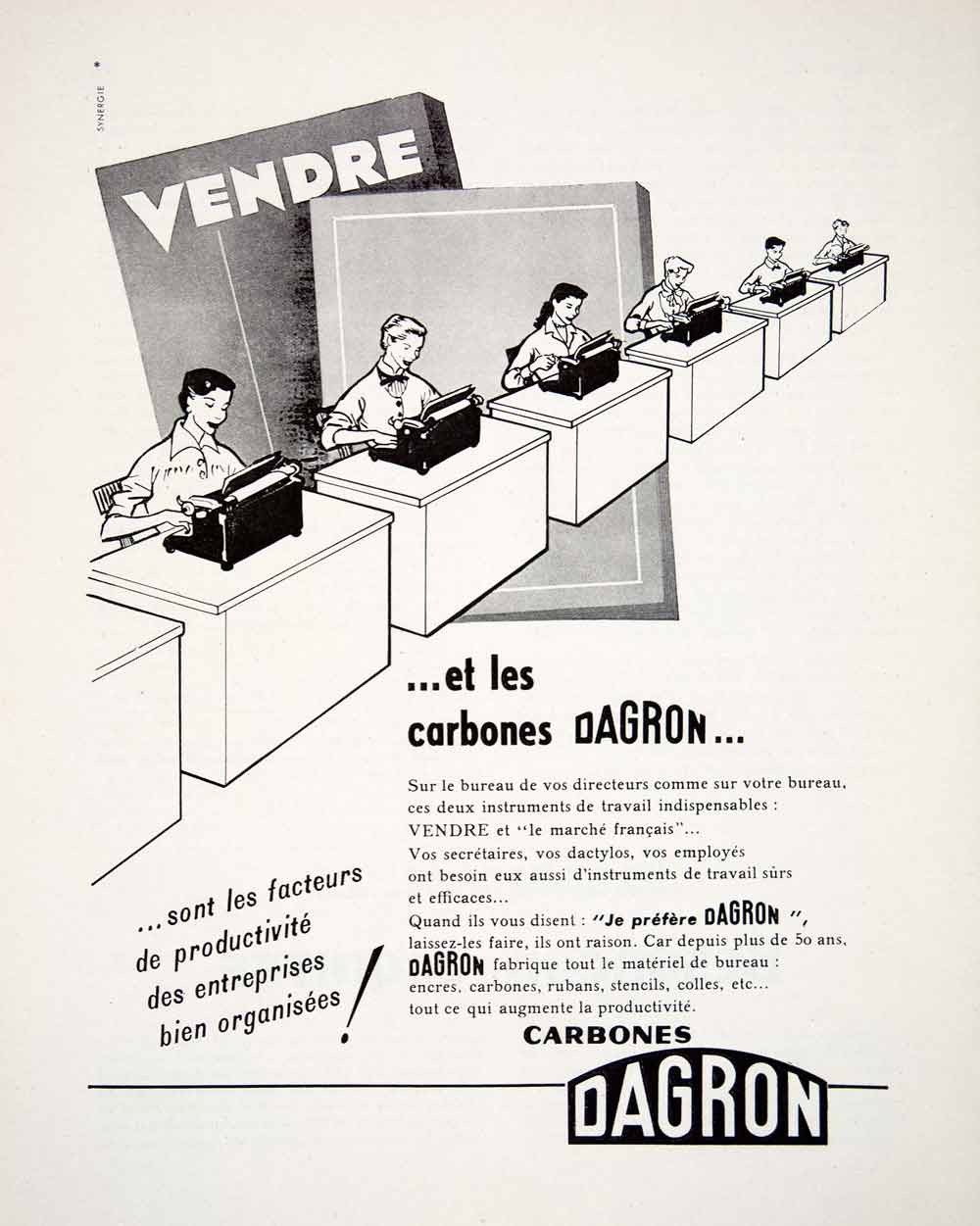 This is an original 1953 black and white print ad for Dagron office supplies, such as typewriter ribbons and ink.
