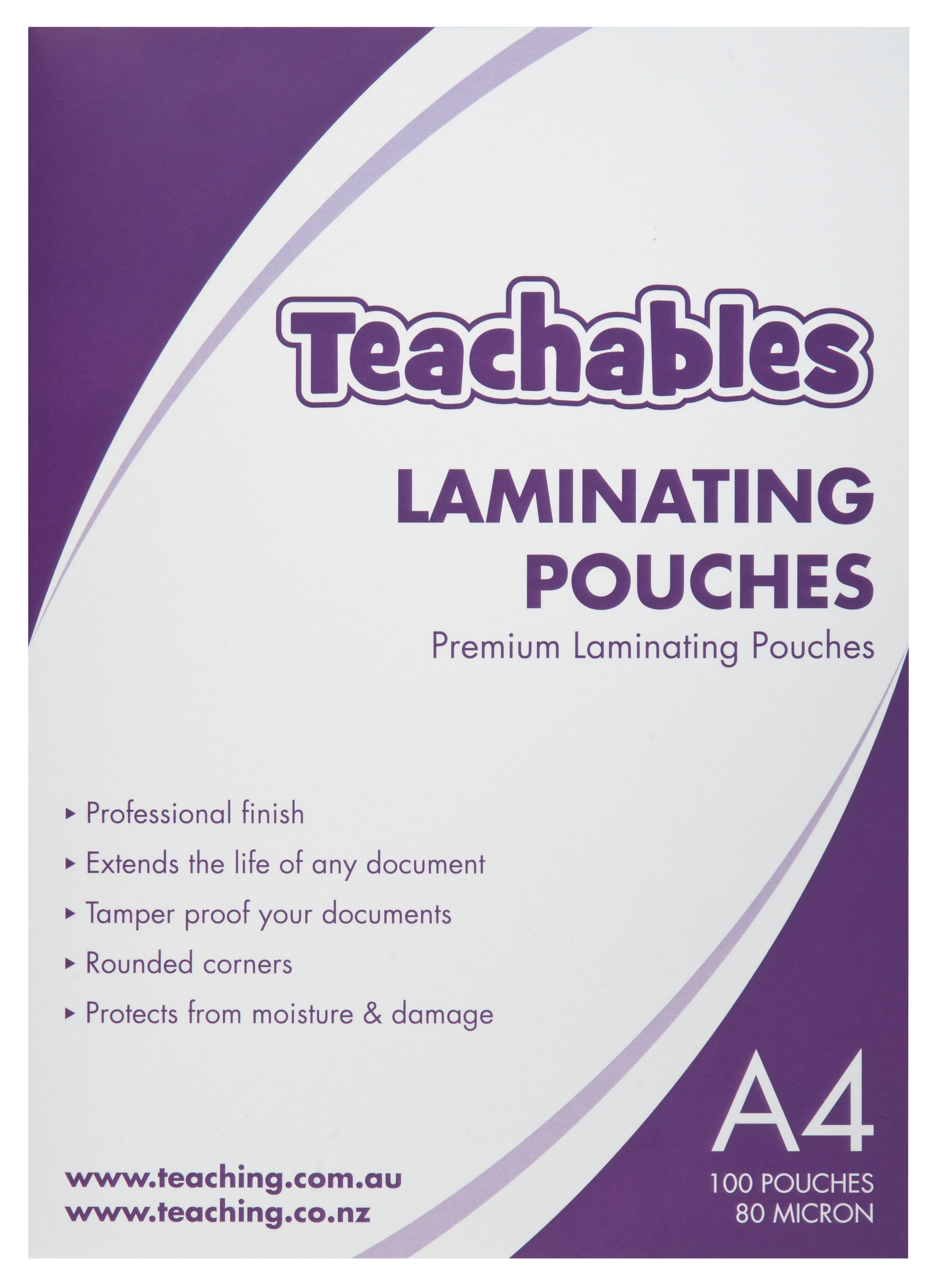 High quality laminating pouches A4 80 micron. Designed specifically for school use to protect and extend the life of any document. Give artwork, messages and frequently handled documents a professional finish.