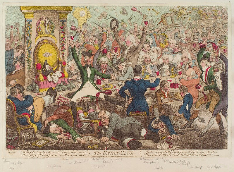This scene of drunken debauchery was a response to a formal print published to celebrate the first meeting of the Union Club, founded after England and Ireland were united in 1800. In the original illustration of the grand inaugural dinner, the Prince of Wales presided over a convivial scene seated on an elaborate throne. Gillray’s version highlights the contentious nature of the Union by showing the Prince lying drunk under the table. Above him, the opposition leader Charles James Fox is collapsed in a chair,… more